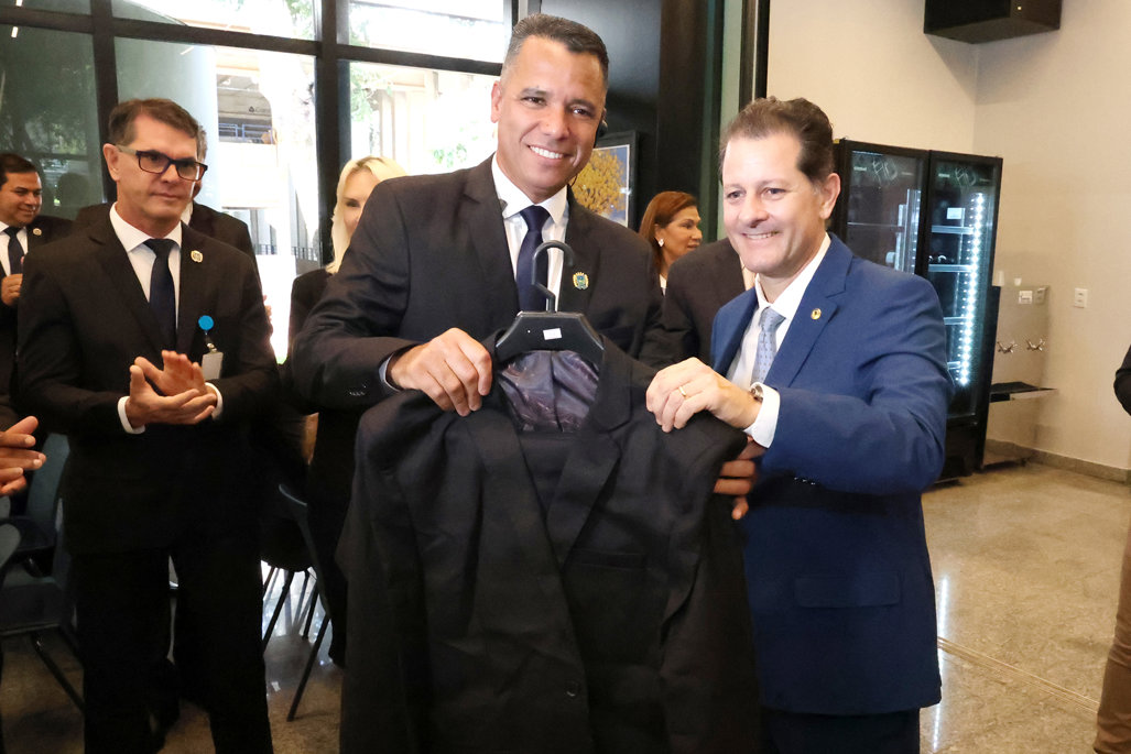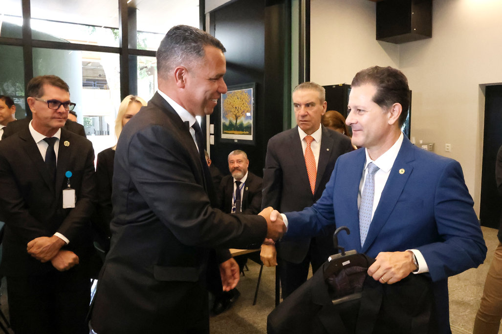 Imagem: Presidente, vice-presidente e 1º secretário participaram da entrega de uniforme aos servidores da ALEMS